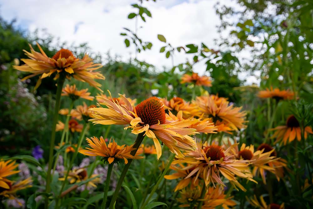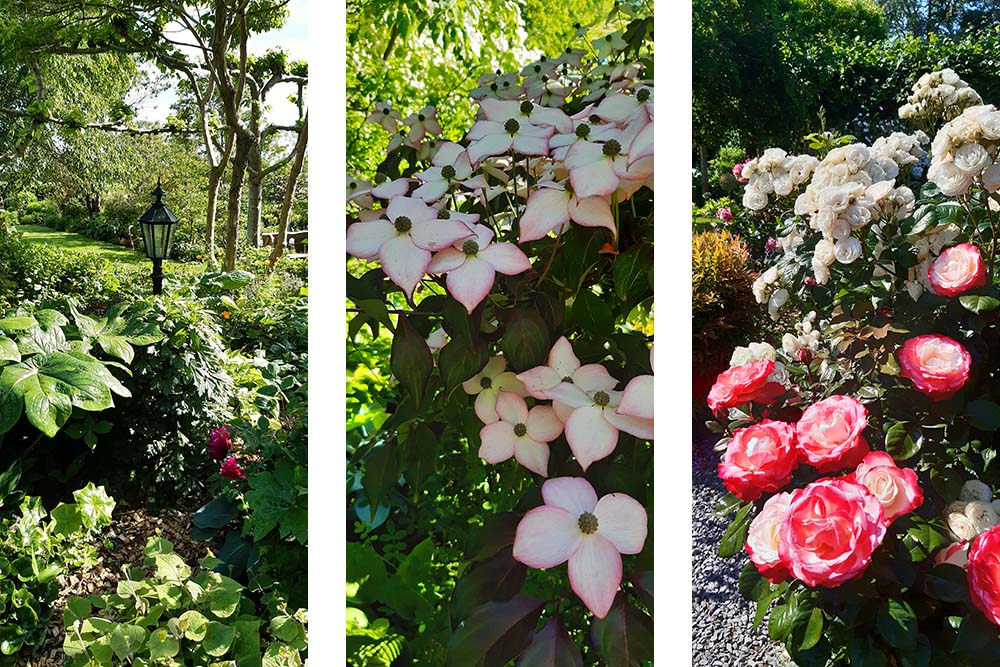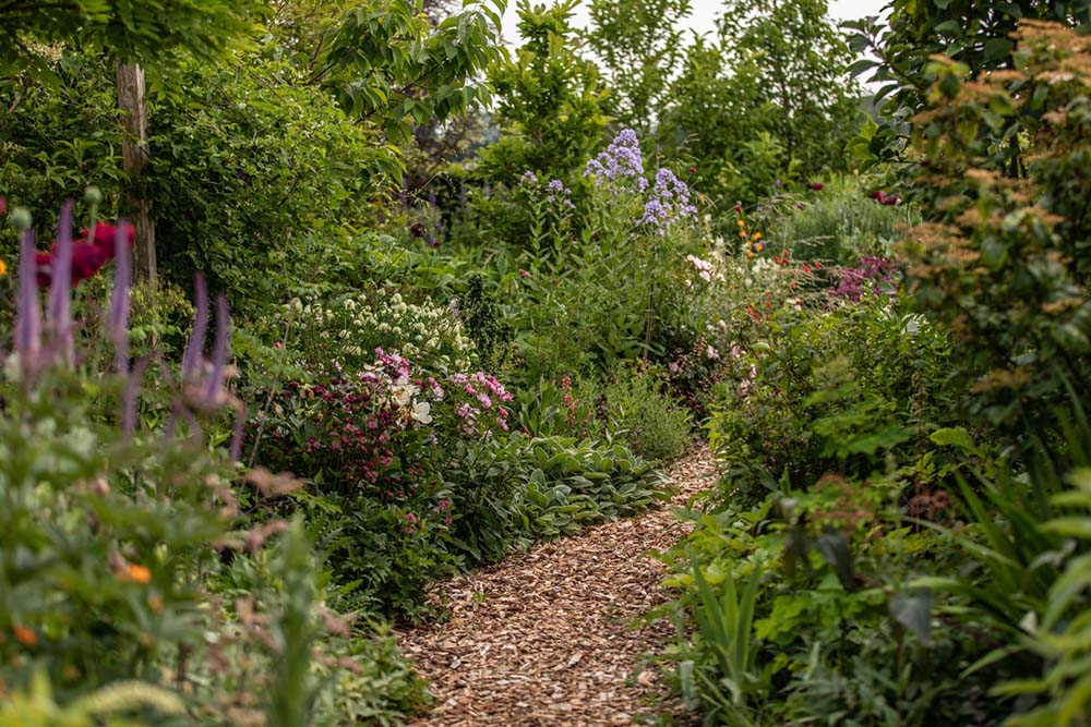Sfeervolle landelijke tuin van 2.400 m2 met weelderige en kleurrijke bloemborders gecombineerd met vele geurende rozen.