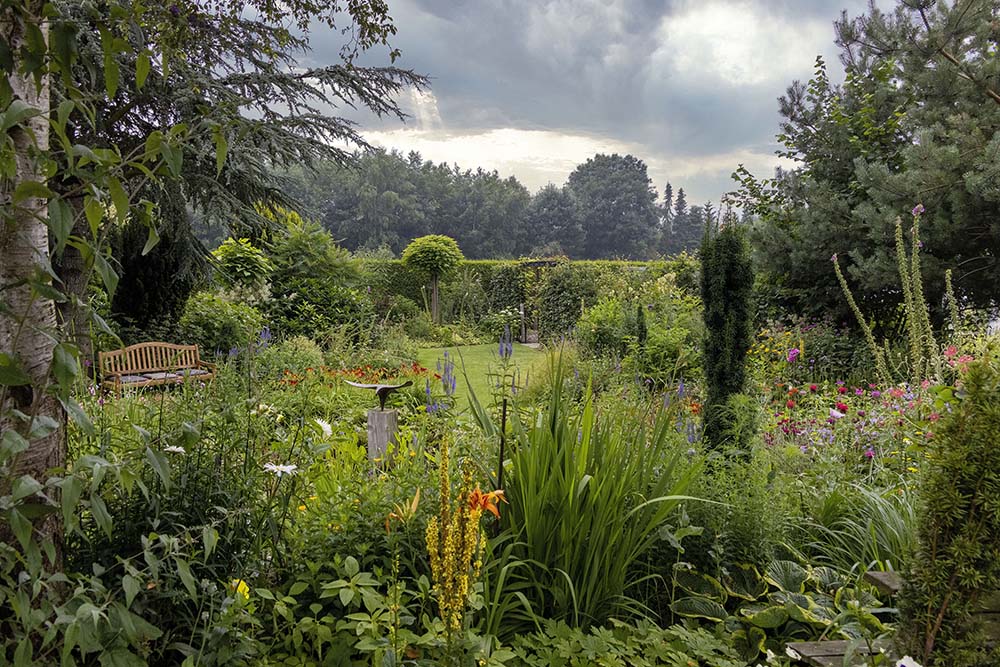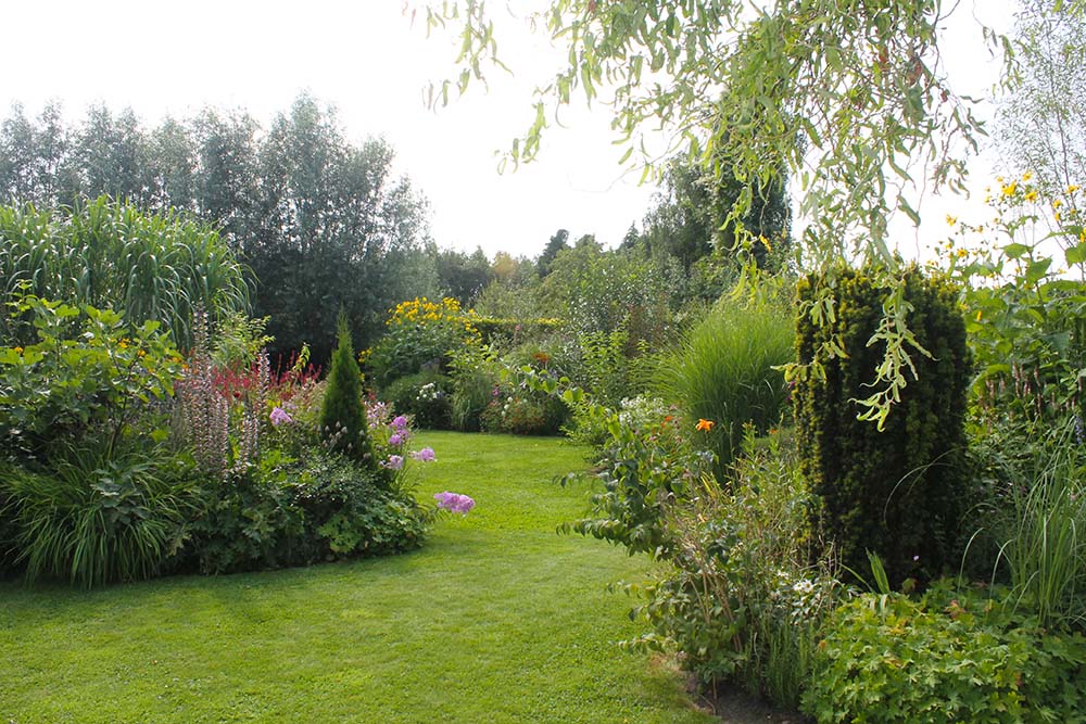 Vanuit de hoger gelegen gerestaureerde voormalige woning van de hoofdmeester uit 1928 kijkt men over de voortuin heen over het Drentse land. Achter en opzij een zeer afwisselende tuin met steeds weer verrassende gedeeltes. Een grote verdiepte vijver, een kruiden- en groentetuin, bordereilanden in het gras, bloemenweiden, een fruitboomgaard en veel verborgen hoekjes. De borders zijn weelderig en kleurrijk en bijna alle eenjarigen en vaste planten zijn zelf gezaaid in de kweekkas. Een vrij jonge tuin van 4.000 m2 waar toch al veel moois te zien is. U bent meer dan welkom om onze trots te komen bekijken, de koffie en thee staan klaar.