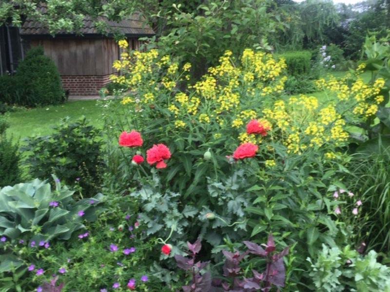 Achter een kleine woonboerderij ligt onze tuin van 1.200 m2 met uitzicht over de es. Binnen de structuur van bomen en hagen liggen borders, een kikkerpoel en een tuinhuis met sedumdak aan een ruim grasveld en enkele verbindende graspaden.