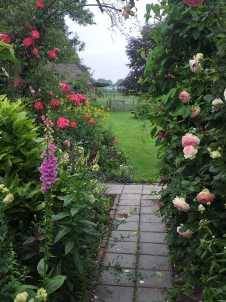 In een tijdsbestek van 30 jaar is de tuin steeds veranderd en dat gaat zo door: van kleine naar grote bomen, van weinig naar veel verschillende vaste planten en rozen, van een net gazon naar een veld met steeds meer ‘onkruid’. Eén- en tweejarigen mochten altijd al meedoen.
