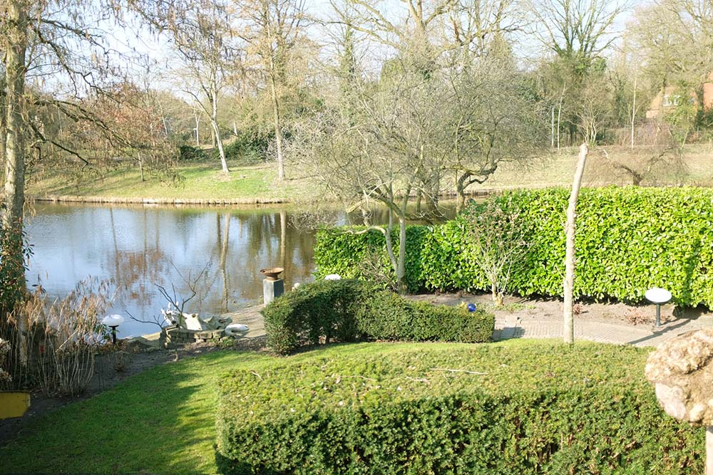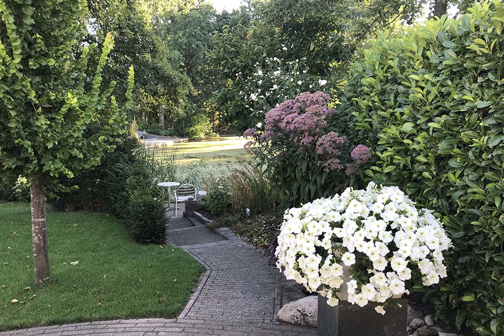 Wij hebben een zeer zonnige tuin van 150 m2 aan een gemeentelijke vijver. De tuin heeft een Engels karakter met een 3-delige hoge boom.