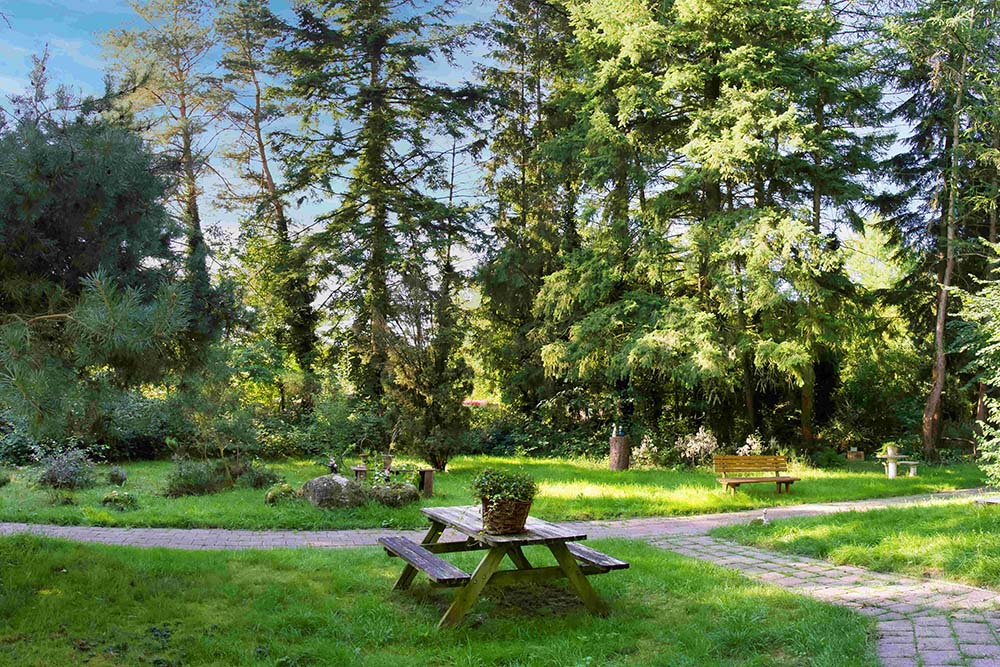 Er zijn diverse zitjes door de tuin.