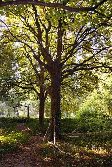 Tuin van 30.000 m2 met boomgaard, 2 vijvers, bosgedeelte, blote voeten pad, bloemenvakken en kunst.
