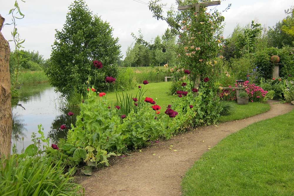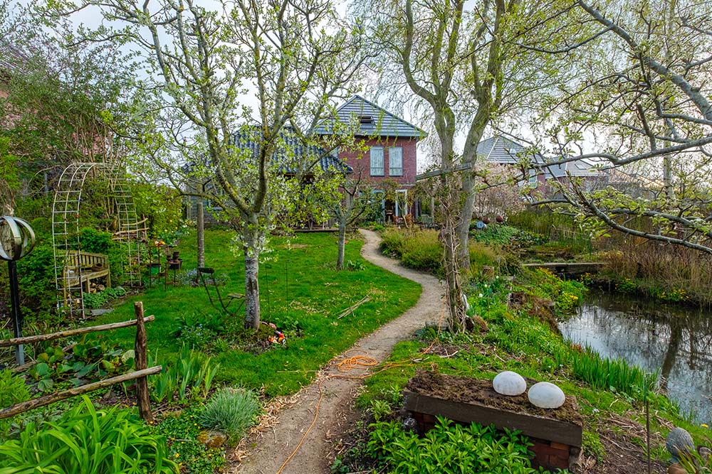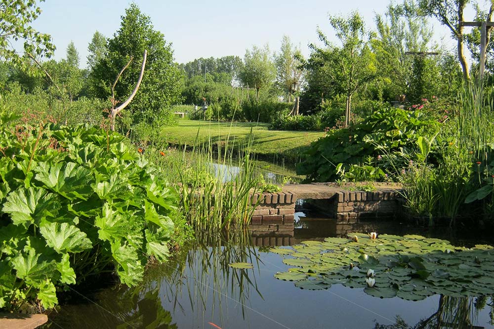 De zichtlijnen zijn zo gekozen dat de tuin en landschap in elkaar overlopen; zo lijkt de tuin groter. Alles meandert hier. De tuin bestaat uit verschillende elementen. Een deel is gecultiveerd en het andere deel is natuurlijk. Behalve water en gazon zijn de drie eilandjes verbonden met houten vlonderpaden. Verder is er een bamboebosje, schaduwtuin, boomgaard en bloemenborders. De voortuin is aangelegd met een evenwichtige plantencombinatie en grassen.