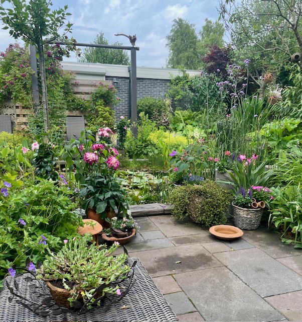 Siertuin van 1.500 m2 met diverse borders van vaste planten, vijvers en terrassen.